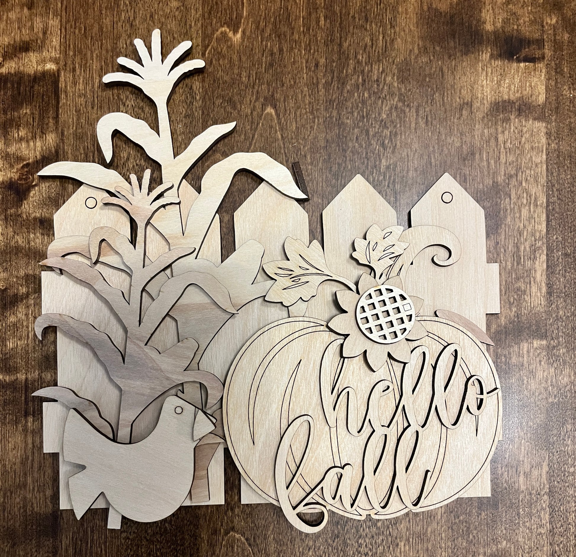 "Hello Fall" wooden sign on a picket fence background; decorated with two corn stalks, a crow, a sunflower, and a pumpkin.