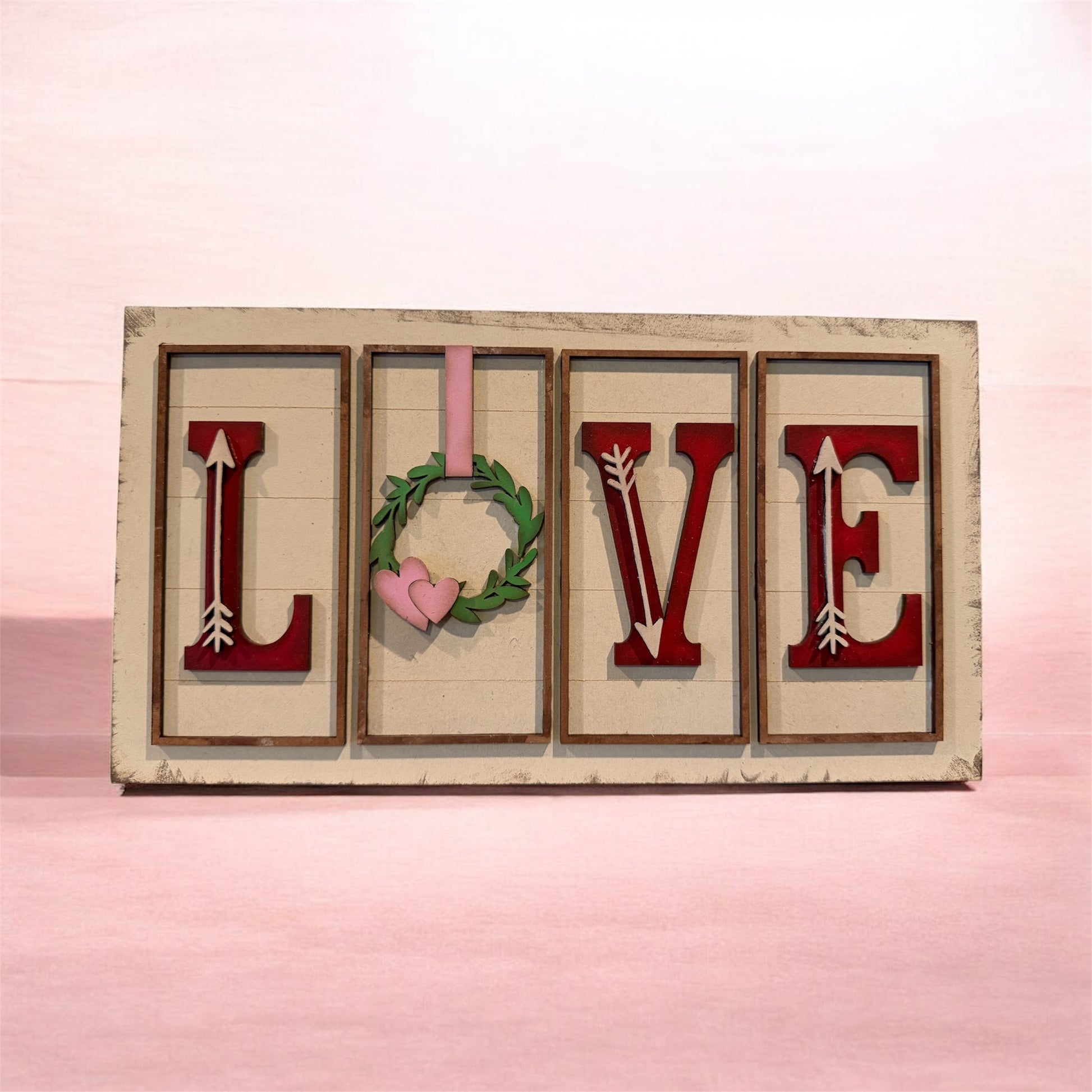 Create a one-of-a-kind piece of home décor with this LOVE Shelf Sitter/Hanger. The unfinished design features four framed panels spelling LOVE, complete with charming details like arrows, a leafy wreath, and sweet heart accents. The clean, laser-cut lines make it easy to paint, stain, or decorate to match your personal style or seasonal décor.