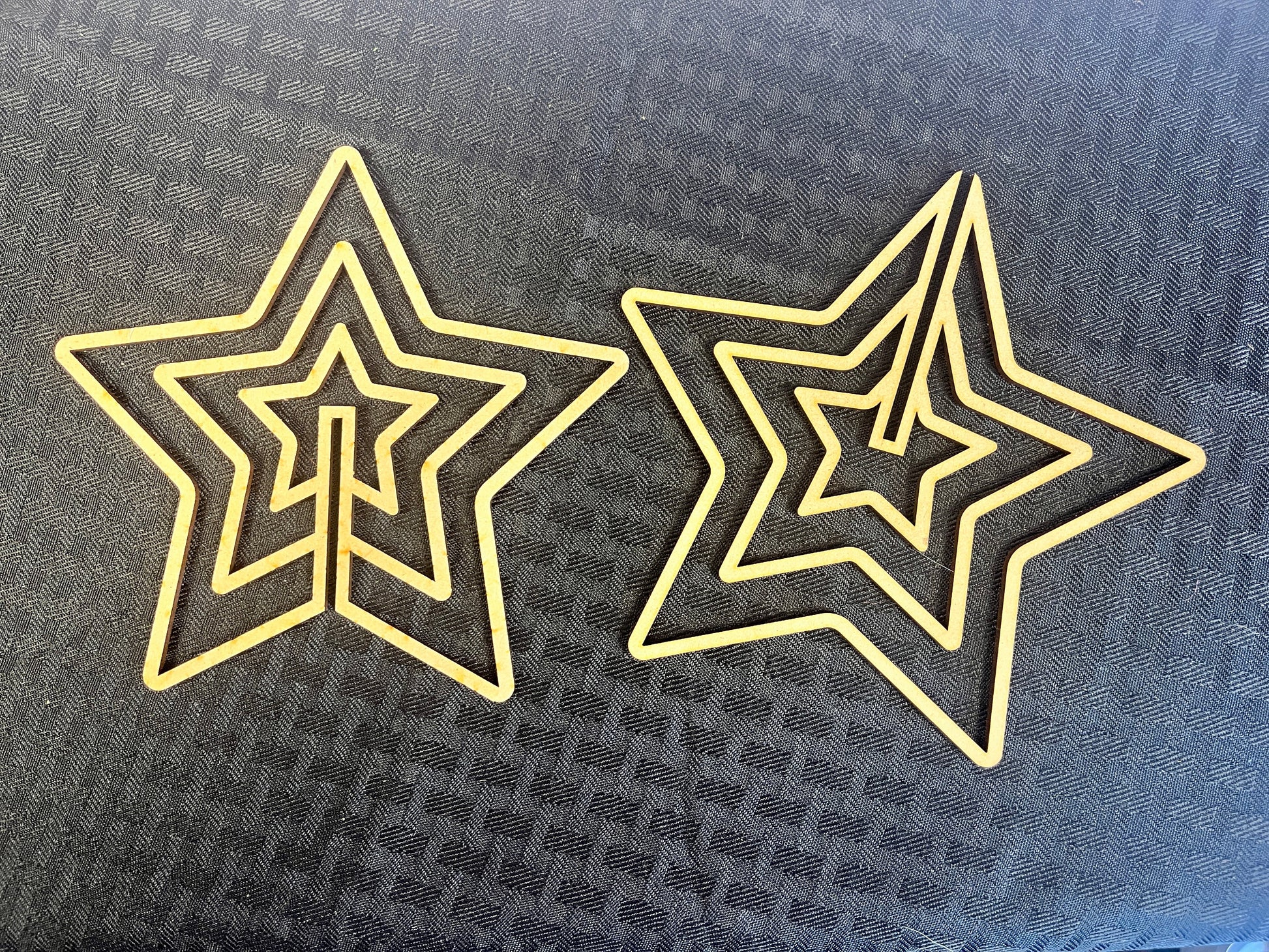 The first star features a nested, open-frame design with alternating red and navy layers, forming a striking geometric centerpiece.