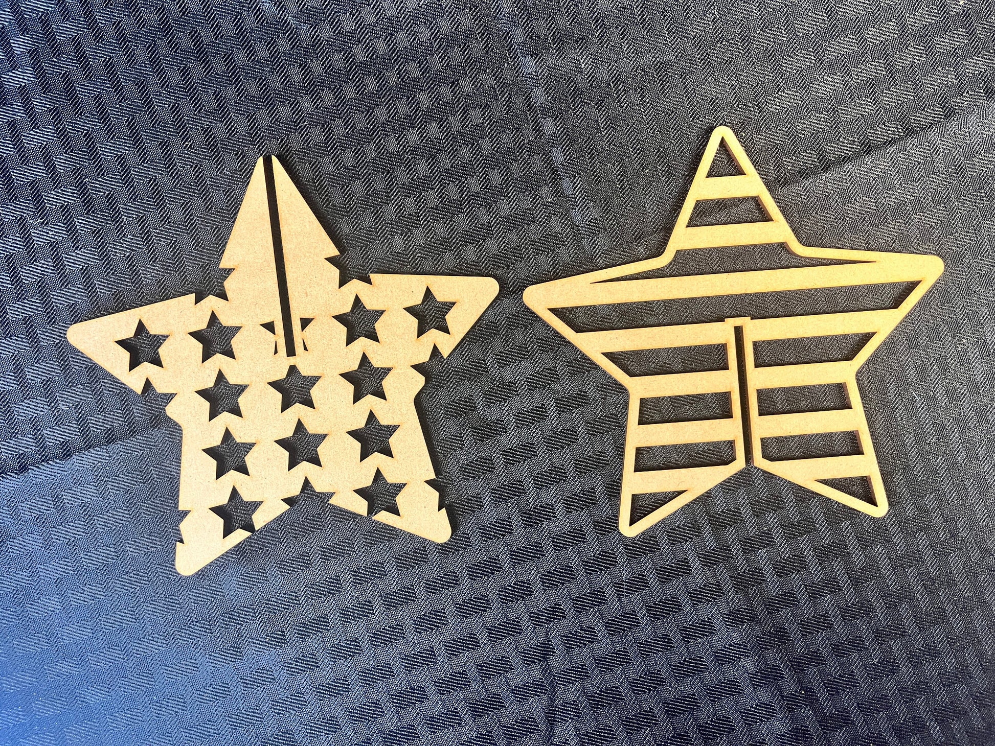 The second star combines two interlocking pieces: one adorned with cutout stars and the other with a striped pattern—together forming a 3D nod to the American flag.