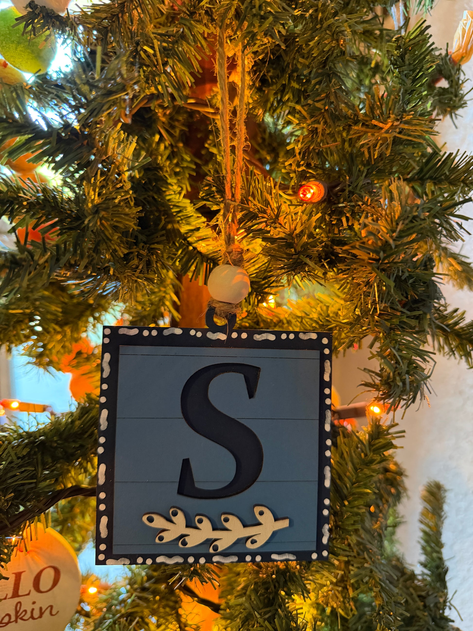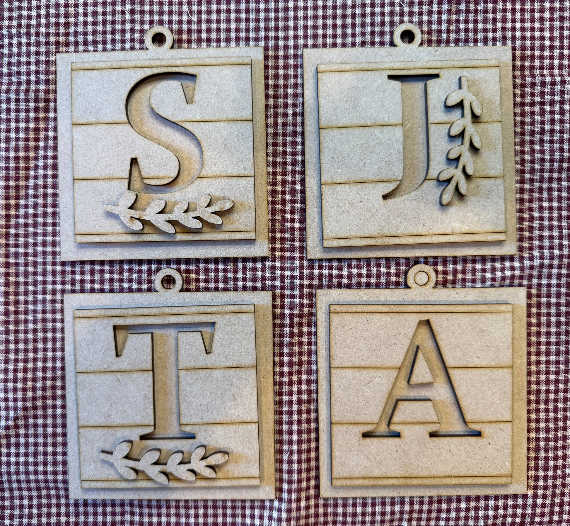 Add a charming, handcrafted touch to your home or holiday décor with these personalized wooden initial ornaments. Each piece is designed with layered wood panels, featuring a bold initial cutout and delicate leaf accent for a cozy, rustic finish.