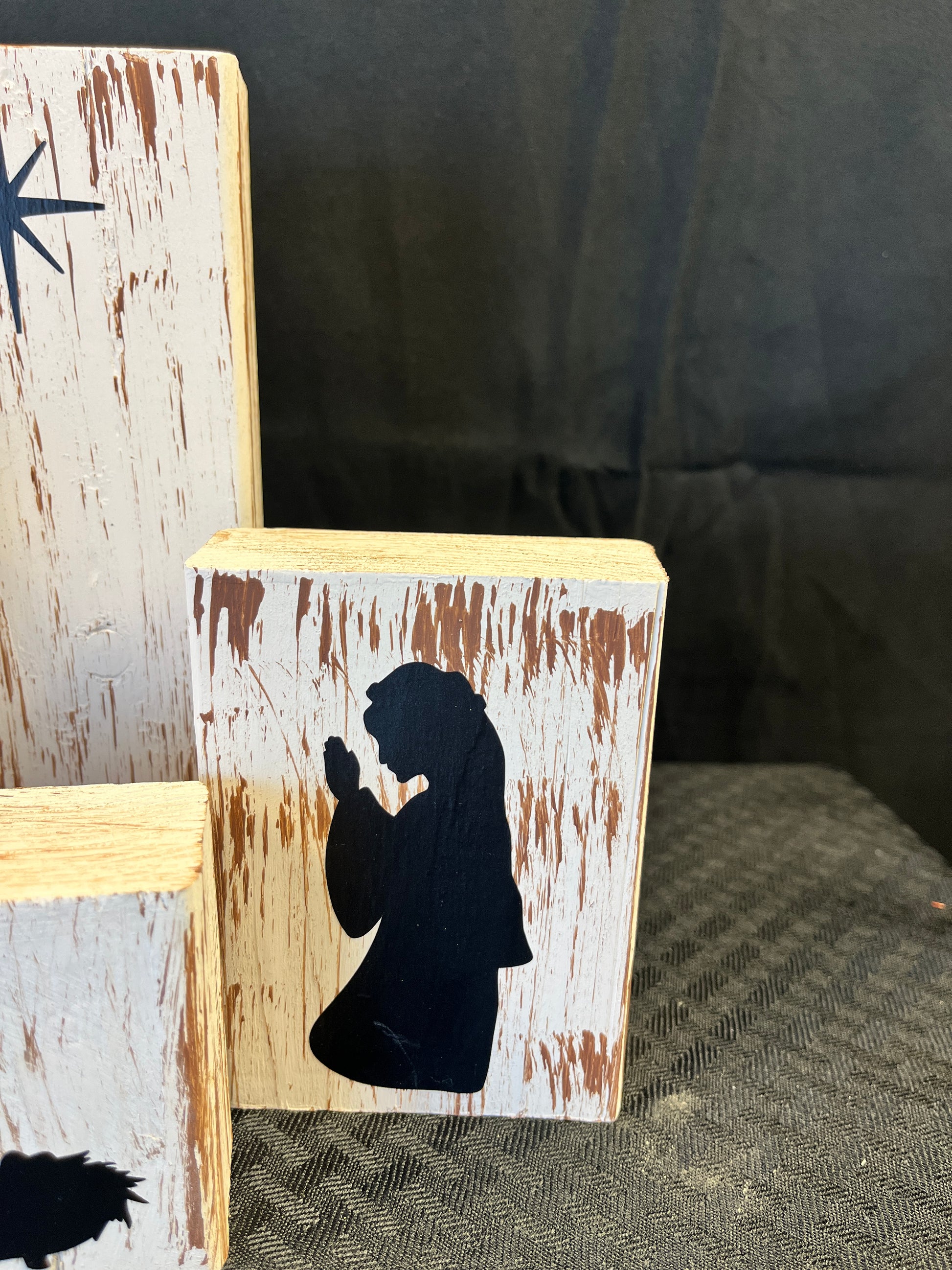 This handcrafted nativity set is made from distressed, whitewashed wood, each block features a black silhouette that brings to life the Christmas story in a simple design. The set includes depictions of a Joseph, Mary, baby Jesus in the manger, and the Star of Bethlehem. Perfect for adding a touch of rustic charm to your home decor, this set fits beautifully on shelves, mantles, or as a centerpiece for holiday displays.