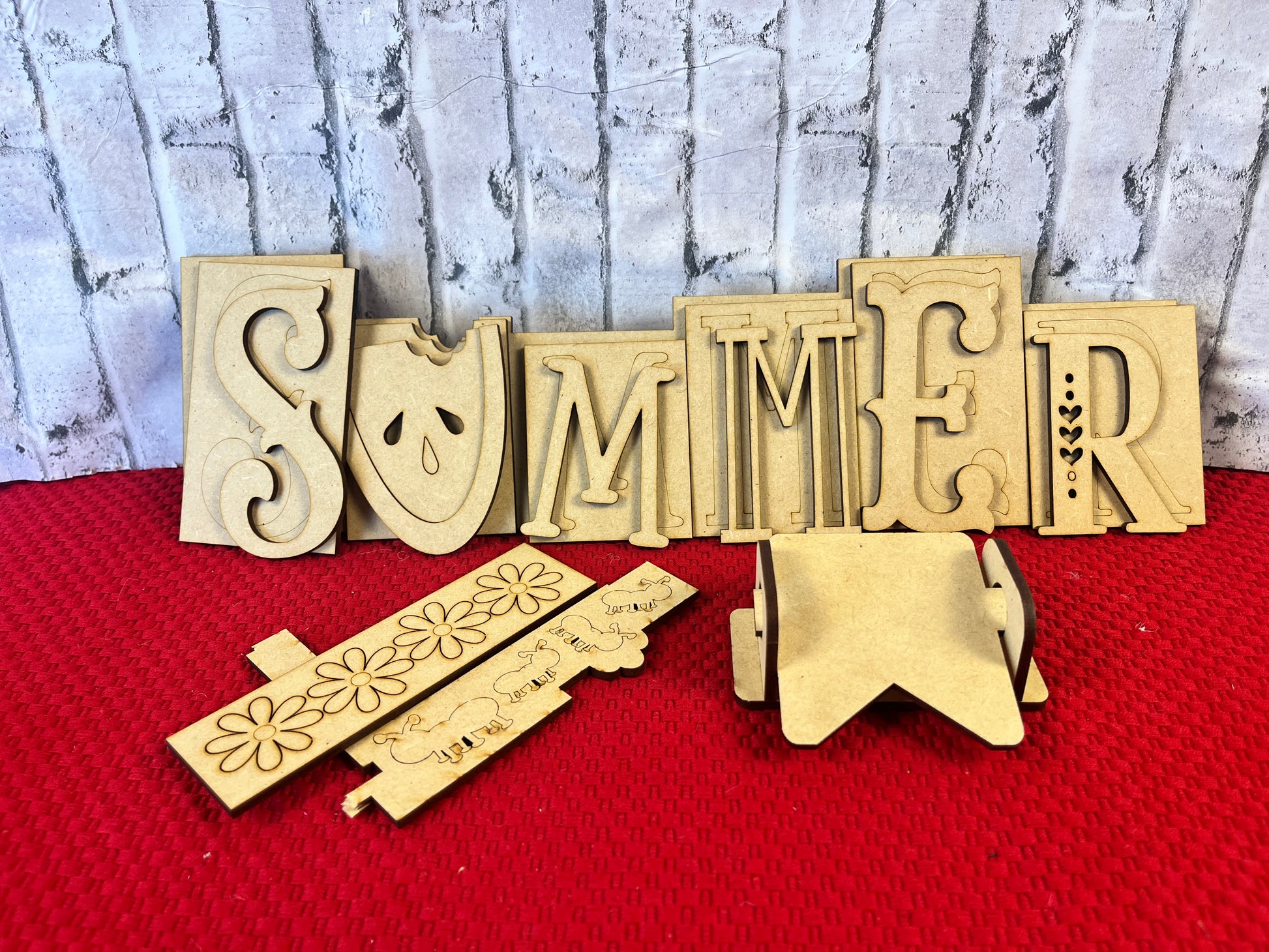 Bring the sunshine inside with this adorable DIY Summer Letter Kit! This unfinished wood craft set spells out "SUMMER" with whimsical details, including a watermelon slice "U" and playful accents like hearts, daisies, and bugs.
